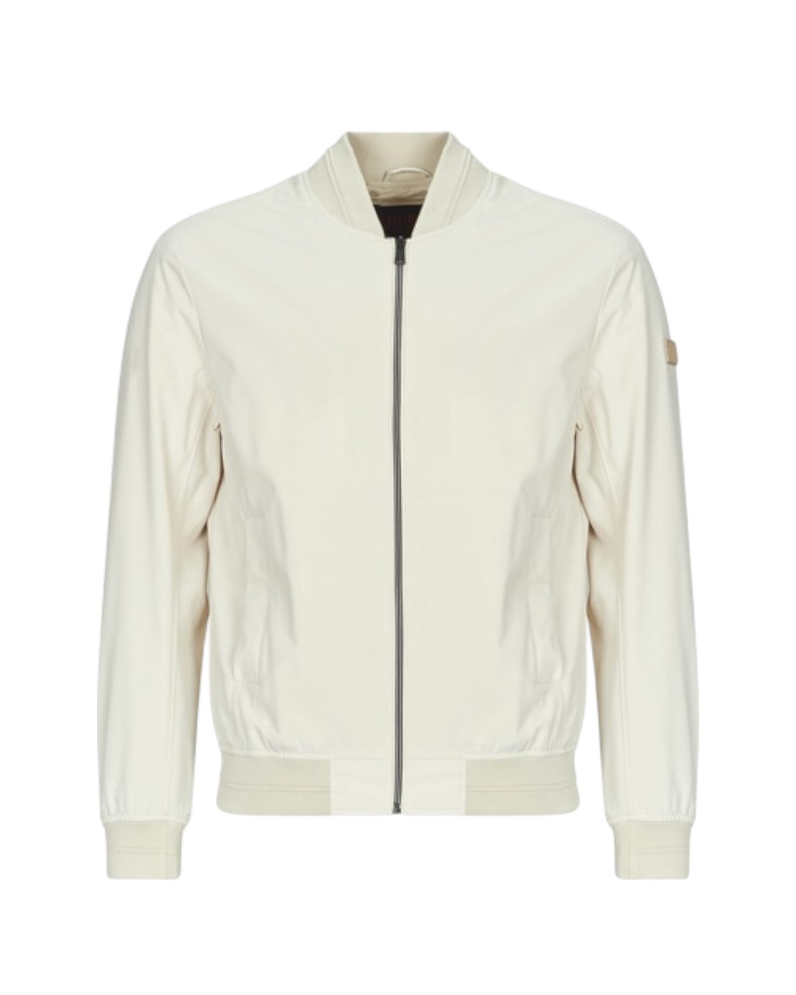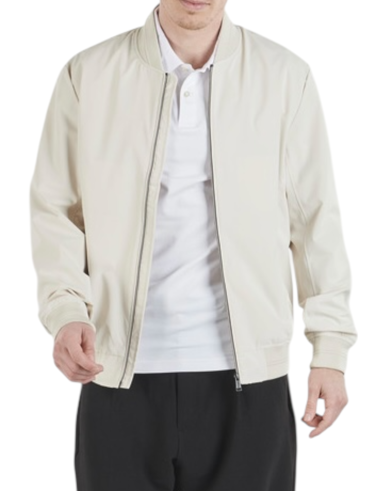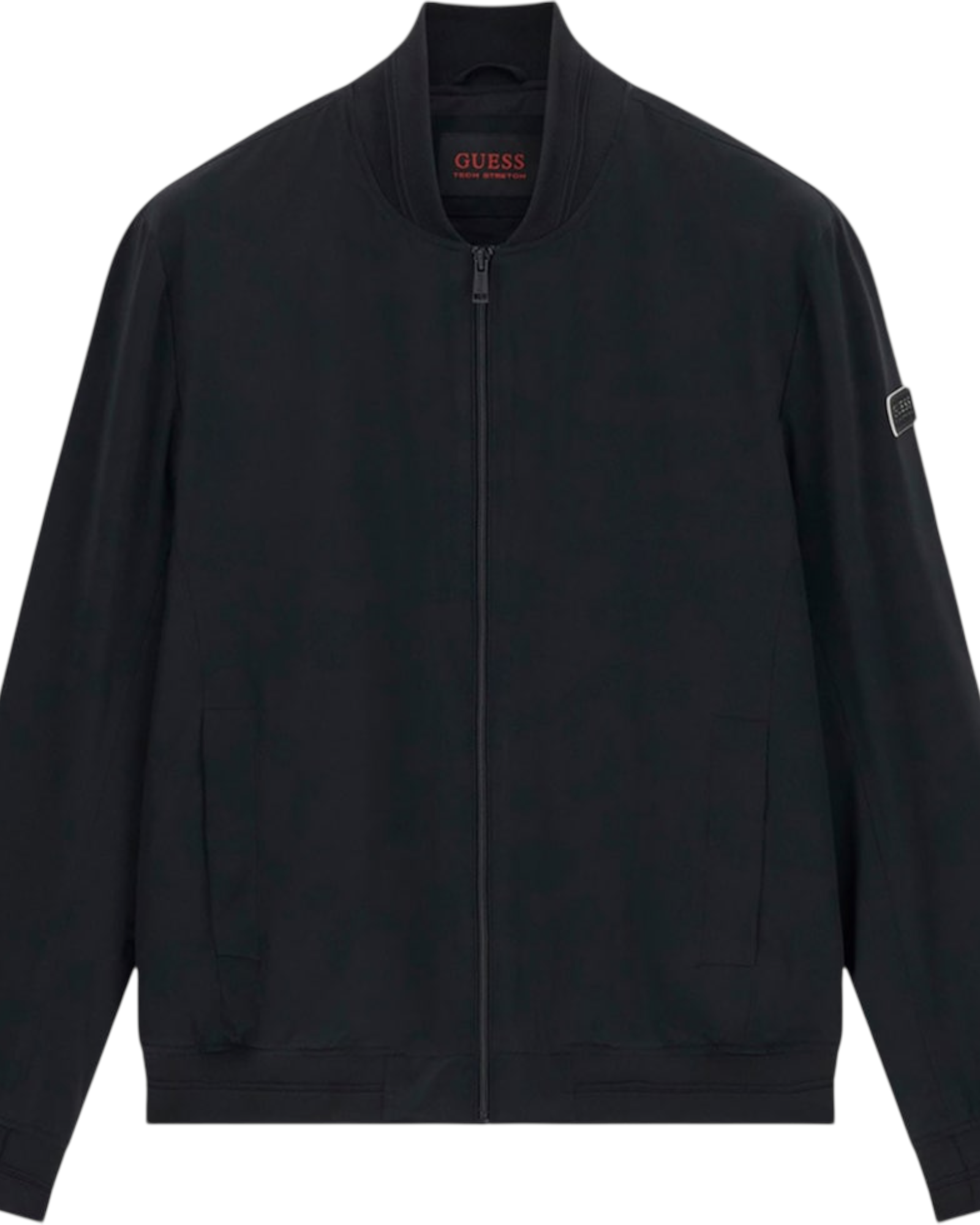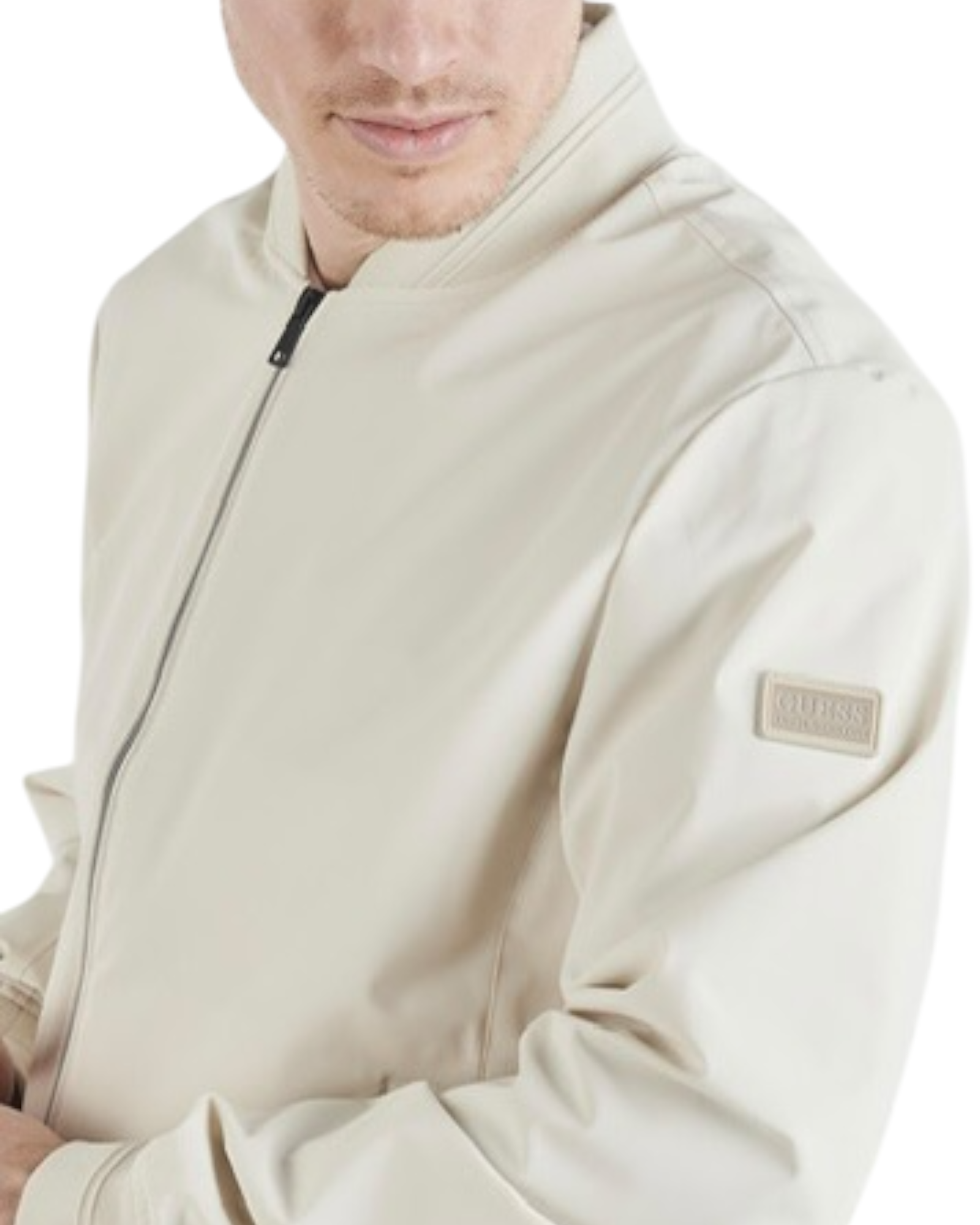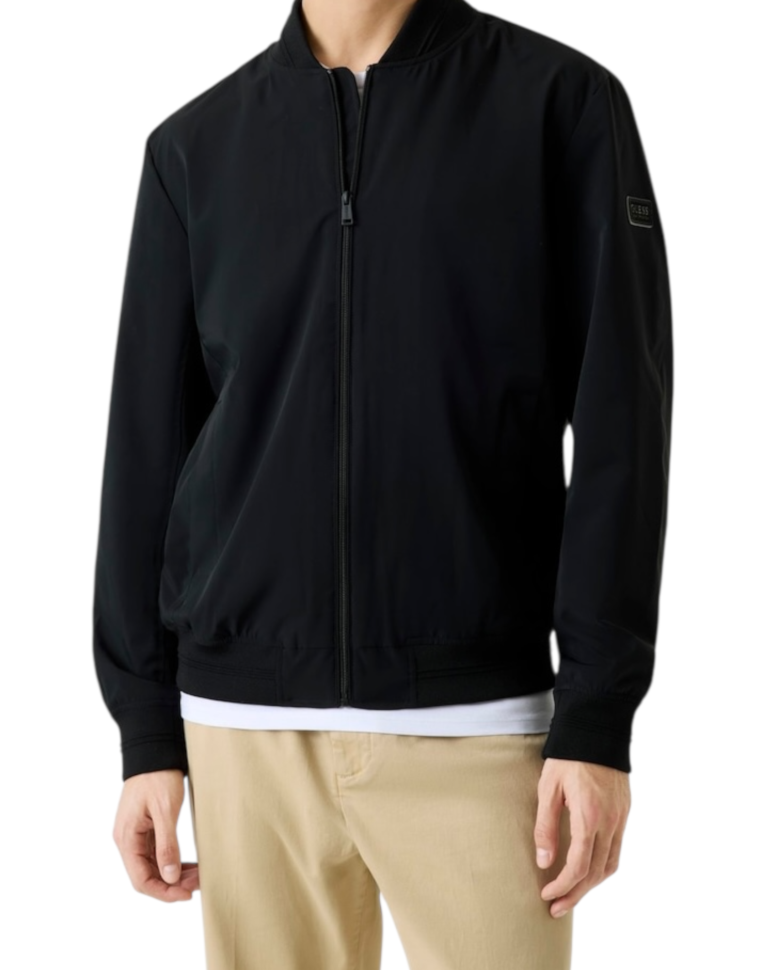 Giubbotto uomo Guess mezza stagione con patch logo su braccio sinistro indossato, nella confezione esce anche una comoda Poquette